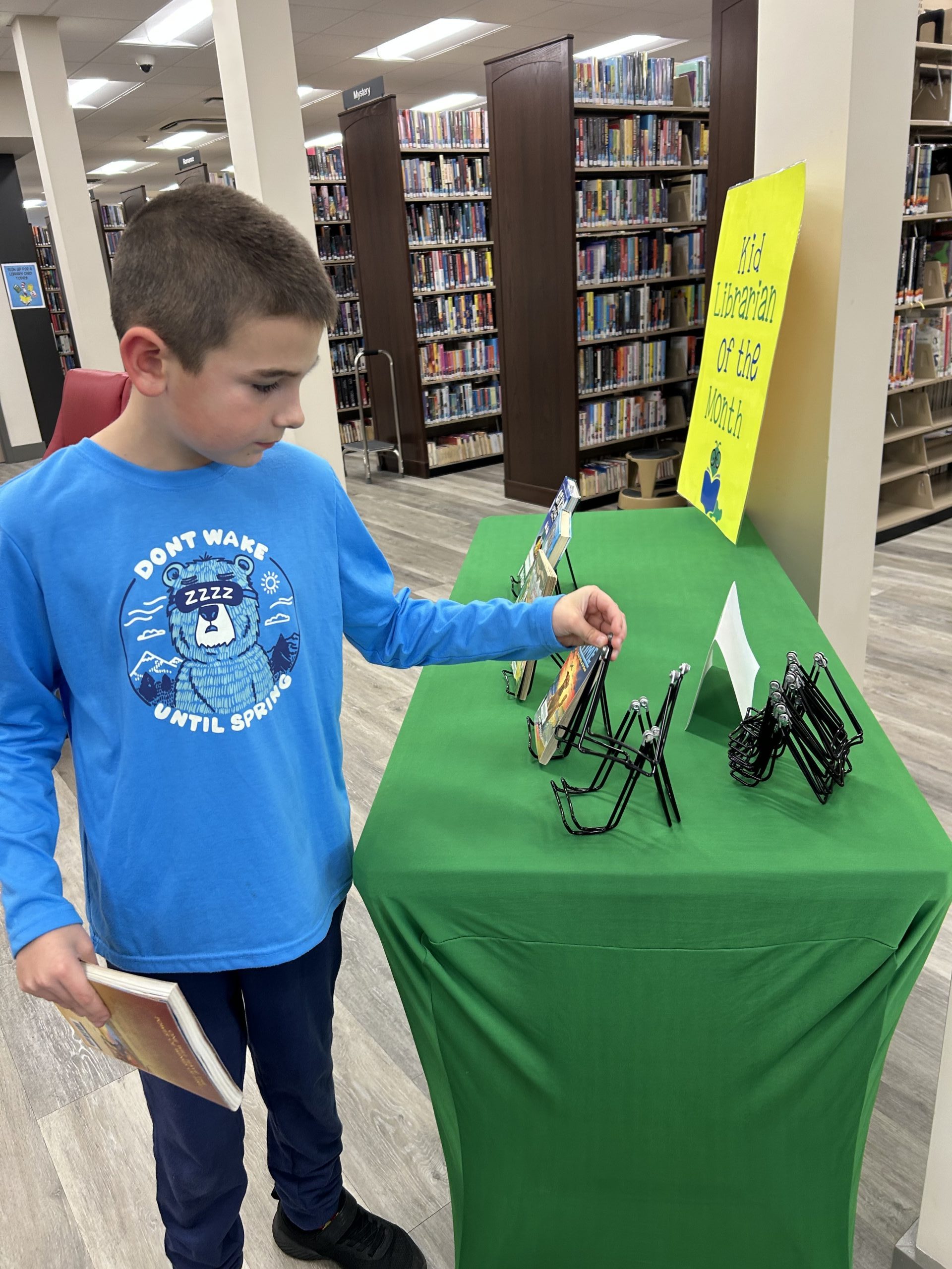 Kid Librarians are chosen monthly to design a juvenile display at the library. Each Kid Librarian may choose a theme for their display, select library materials to highlight and decide how to organize and best show off the chosen titles. New Kid Librarians are selected each month for each library branch (Harbin Memorial and Central City).